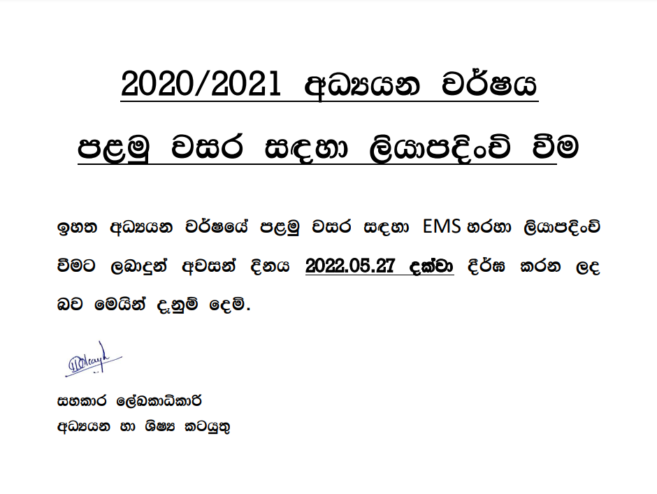 2020/2021 ශිෂ්‍ය ලියාපදිංචිය දීර්ඝ කිරීම