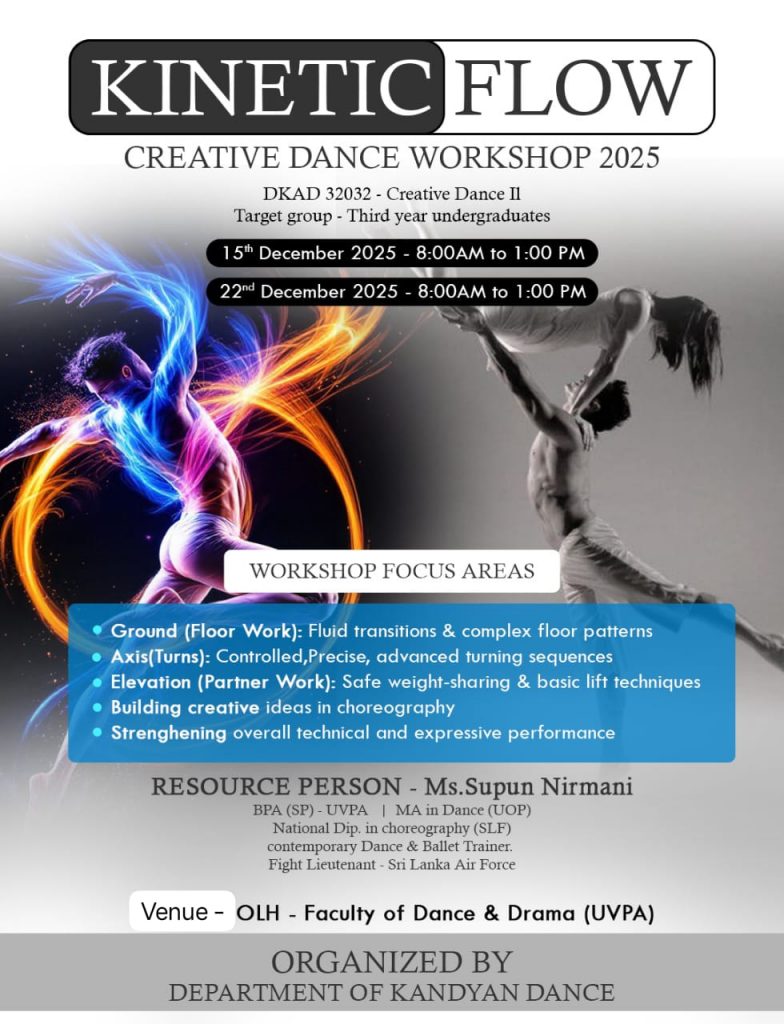 As a cornerstone of the University of Visual and Performing Arts, the Department of Kandyan Dance continues to uphold its mission of celebrating the legacy of Kandyan dance while preparing its graduates to excel in the dynamic fields of performing arts, cultural advocacy, and creative industries.